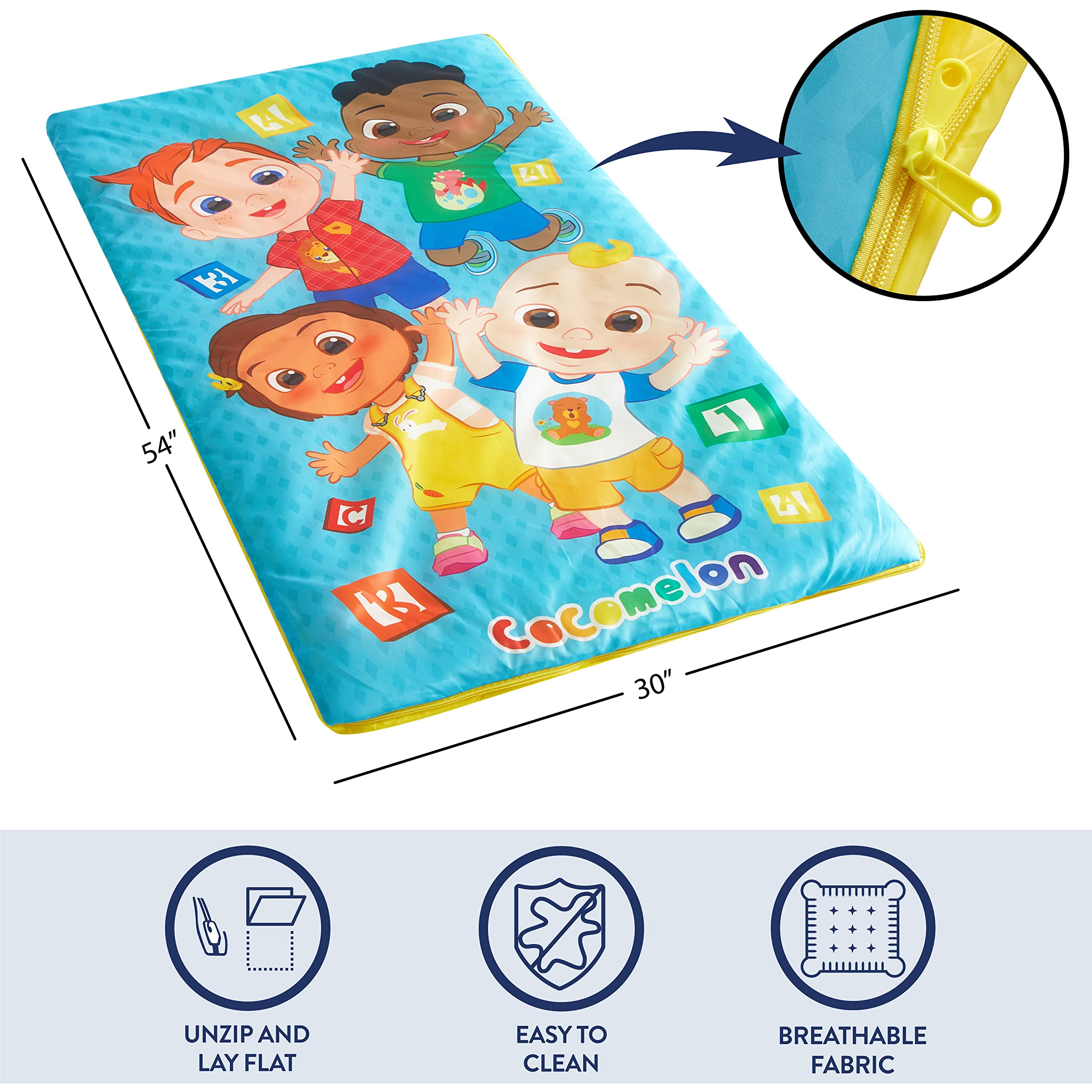 - DESIGN: This slumber set features fun and cool graphics from Cocomelon. The perfect go to sleeping bag set for your child during nap time, travel, pre-k and camp. Designed with the iconic characters from the well known brand. The design on this slumber set will add a pop of color along with your childās favorite characters.