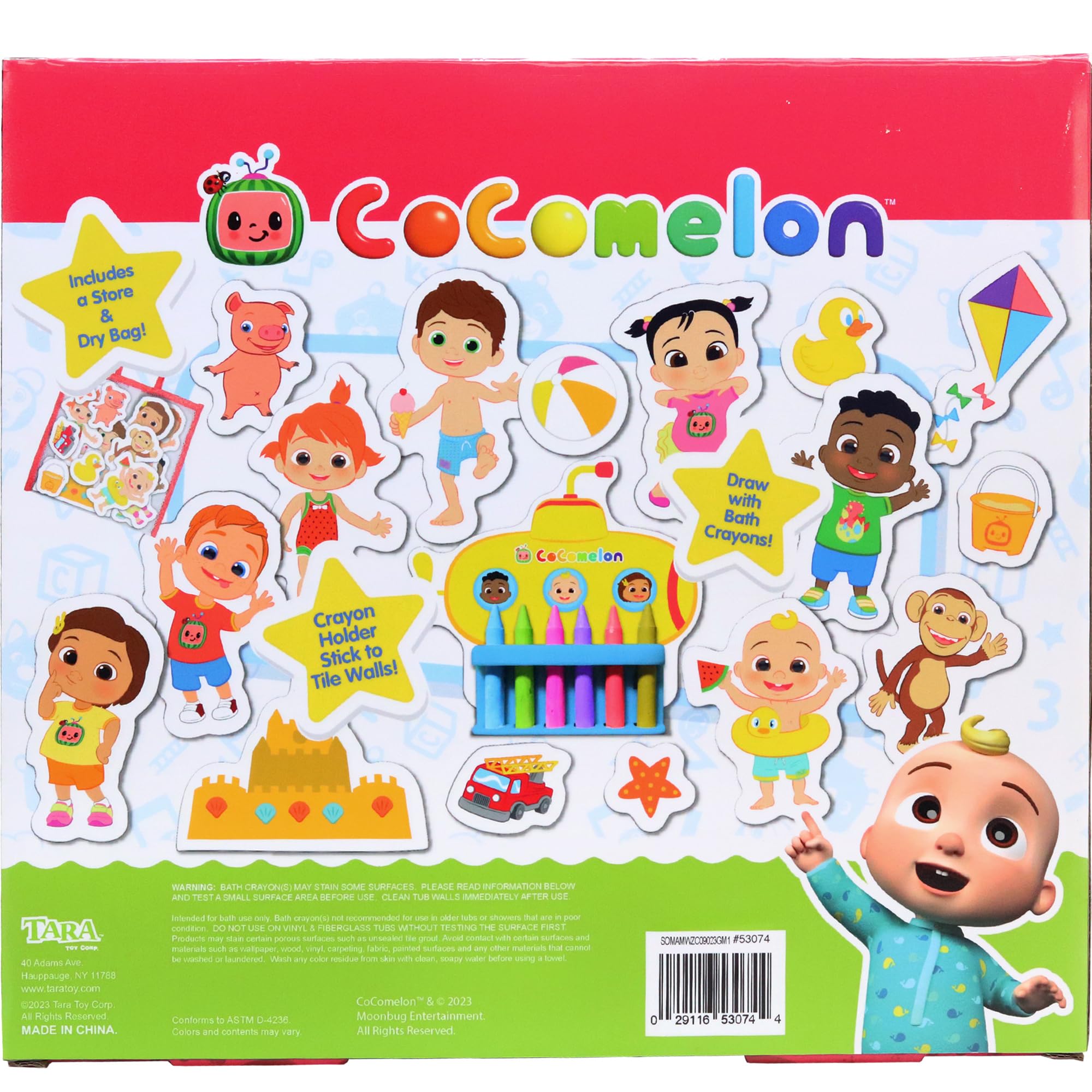 - COCOMELON BATHTIME ACTIVITY SET INCLUDES: 16 bath-friendly foam pieces of Cocomelon characters, 6 waterproof bath crayons with holder and 1 mesh storage bag.